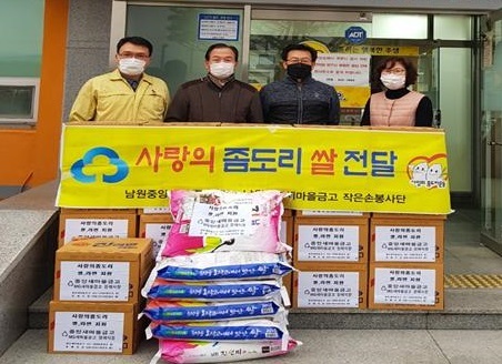남원중앙새마을금고는 작은손봉사단과 함께 ‘좀도리 쌀’ 나눔 운동을 전개하면서 쌀 48포(20kg)와 라면 213박스(720여 만원 상당)를 남원시에 기탁했다.