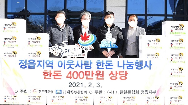 대한한돈협회 정읍시지부(지부장 이성수)는 지난3일 정읍시청을 방문해 어려운 이웃들에게 전달해 달라며 돼지고기 310㎏(400만원 상당)을 기탁했다.