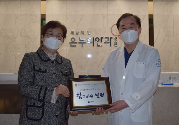 전북지방병무청(청장 이영희)은 4일 병역자진이행자 무료치료 후원기관인 온누리안과병원에 ‘병역이행자에게 희망을 주는 참 고마운 병원’ 인증 현판을 전달했다.