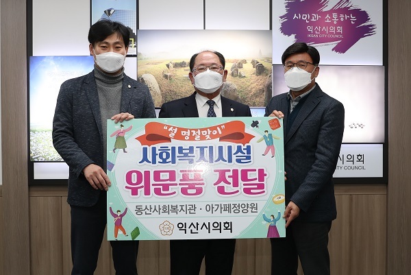 익산시의회(의장 유재구)는 사회복지시설인 동산사회복지관, 아가페정양원 등에게 쌀, 라면, 과일 등의 설맞이 위문품을 전달했다.