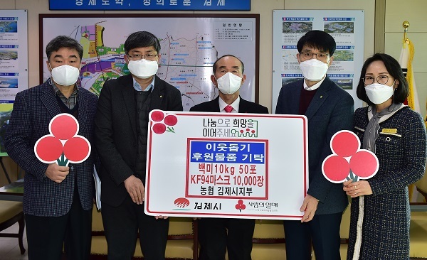 농협 김제시지부(지부장 김태곤)는 8일 관내 저소득층에게 전달해 달라며 KF94 마스크 10,000장, 백미 10kg 50포를 김제시에 기탁했다.