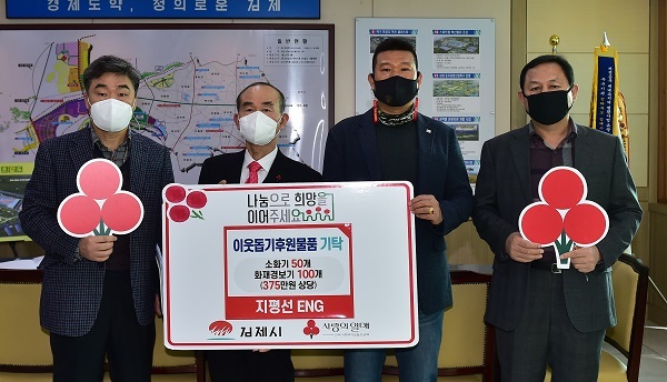 지평선 ENG(공동대표 이석봉, 김중형)은 8일 설 명절을 앞두고 코로나 19로 어려운 이웃과 화재에 취약한 세대에 375만원 상당의 소화기 50개와 화재경보기 100개를 김제시에 기탁했다.