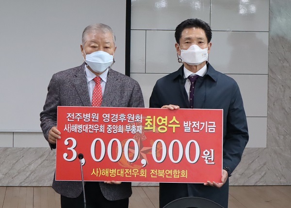 전주병원 영경후원회(회장 박경희)가 환경 정화활동을 통한 지역사회 봉사에 힘쓰고 있는 해병대전우회 전북연합회에 후원금 300만 원을 전달했다.