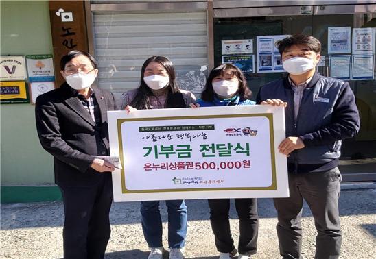 한국도로공사 전북본부(본부장 김주성)는 지난 9일 설 명절을 앞두고 전주 삼성휴먼빌(보육원), 노인사랑노인복지센터, 진북꽃길작은도서관, 전주 생명의 전화 등 도내 사회복지시설을 방문해 총 200만원 상당의 온누리 상품권을 전달했다.
