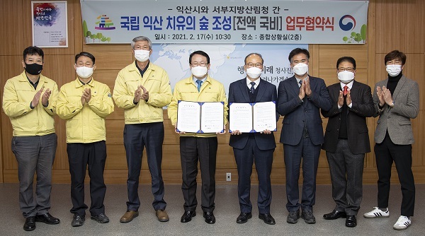 익산시와 서부지방산림청은 17일 익산시청에서 정헌율 시장과 조준규 서부지방산림청장이 참석한 가운데 품격있는 산림복지시설 구축이라는 공동 목표 달성을 위한 업무협약을 체결했다.
