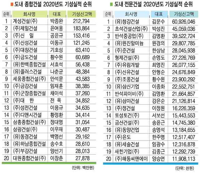 전문건설 업체 가운데 609억원을 신고한 (유)청강건설(대표 김문수)가 올해 도내 업체 중 기성신고액 1위를 차지했고 초석건설산업(주)(대표 박성진)이 450억으로 2위를, 반석중공업(주)(대표 김명환)이 3위(395억원), (유)원진알미늄(대표 원경의)이 298억으로 4위, (주)준건설(대표 한상남)이 5위(280억)를 차지했다.