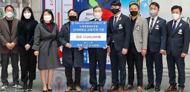 국제라이온스협회356ㅡC(전북)지구(총재 박병익)는 9일 라이온스전북지구 회의실에서 ㈔생명평화마중물 선너머학교(교장 조봉의)에 교육기자재 구입비용 1000만 원을 전달했다고 밝혔다.