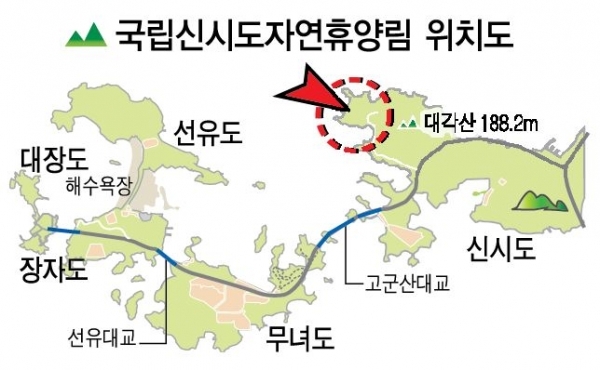 신시도 자연휴양림은 총 230억원(당초 86억원)이 투입돼 120㏊ 규모로 조성됐으며 이는 국립 휴양림 중 최대 규모인 것으로 알려졌다
