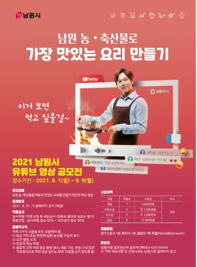이번 공모전의 주제는 ‘남원 농·축산물로 가장 맛있는 요리 만들기’로 지난 2일부터 8월 9일까지 공고기간을 거쳐 8월 1일부터 8월 9일까지 접수할 예정이다.