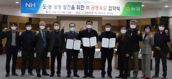 남원농협(조합장 박기열)과 운봉농협(조합장 서영교), 지리산농협(조합장 정대환)은 10일 남원농협 회의실에서 도·농 상생발전을 위한 ‘벼 공동육묘 협약’을 체결했다.