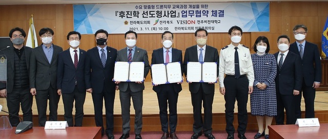 전북도의회와 전북도, 전주비전대학교가 전북형 뉴딜산업과 연계해 전북지역 드론산업 생태계 구축에 앞장서기로 했다. 이를 위해 지역소방관 맞춤형 드론 직무 교육과정 개설과 운영에 들어간다.