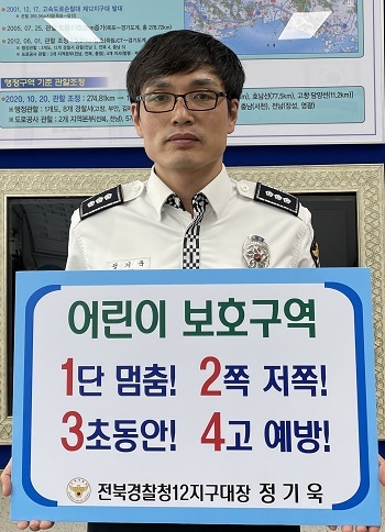 11일 전북경찰청 SNS에는 정기욱 12지구대장이 ‘1단 멈춤! 2쪽 저쪽! 3초 동안! 4고 예방!’이라는 어린이 교통안전 릴레이 챌린지 구호를 들고 촬영한 사진이 올라와 어린이 교통안전을 위한 방법을 홍보하고, 운전자들에게 어린이보호를 위한 의식개선을 촉구했다.