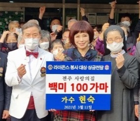 가수 현숙이 지난 11일 오후 전주사랑의 집을 방문해 2021라이온스봉사대상 상금으로 받은 500만 원 전액을(백미 100기마)기부했다.
