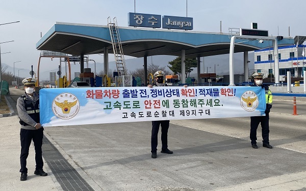 제9지구대원들은 지난 2일부터 매주 화·목요일 주요 톨게이트와 휴게소를 선정, ‘화물차 안전거리 및 지정차로 준수’, ‘적재물 추락방지’ 등의 캠페인 문구가 적힌 플래카드를 들어 홍보하고 화물차 운전자들에게 캠페인 전단지를 배부하고 있다.
