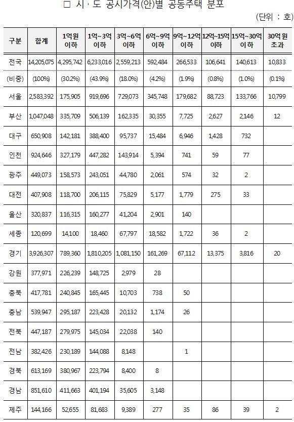 실제 도내 공동주택 44만7187호 가운데, 1억 원 이하 주택이 27만9975호로 가장 많았고, 1억 원~3억 원 사이가 14만5034호, 3억 원~6억 원이 2만2038호인 것으로 집계됐다. 6억 원 이상 9억 원 이하는 140호에 불과했고, 9억 원 이상은 전무했다.