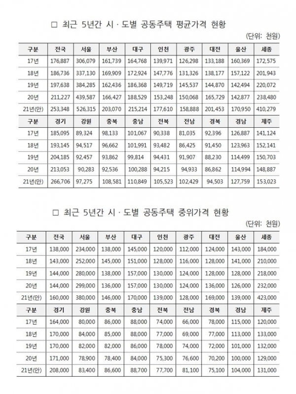 국토교통부는 지난 15일 아파트, 연립주택, 다세대주택 등 도내 공동주택 44만7000여 세대에 대한 2021년 공시가격(안)을 발표했다.