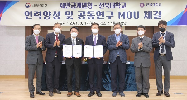 전북대학교(총장 김동원)와 새만금개발청(청장 양충모)은 17일 오후 3시 새만금개발청 대강당에서 김 총장과 양 청장, 양측 관계자들이 참석한 가운데, 새만금 성공적 개발을 위한 인력양성사업 공동추진을 위한 협약을 체결했다.