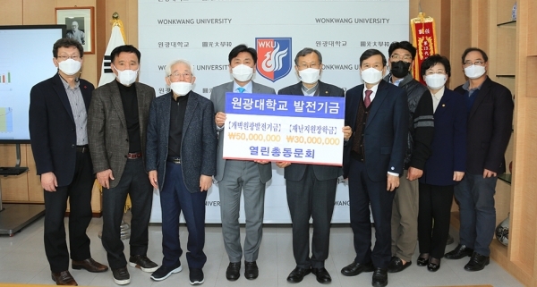 원광대학교 열린총동문회(회장 박영석)는 지난 17일 박맹수 총장을 방문해 발전기금 5,000만원과 장학금 3,000만원 등 총 8000만원의 기부금을 전달했다.