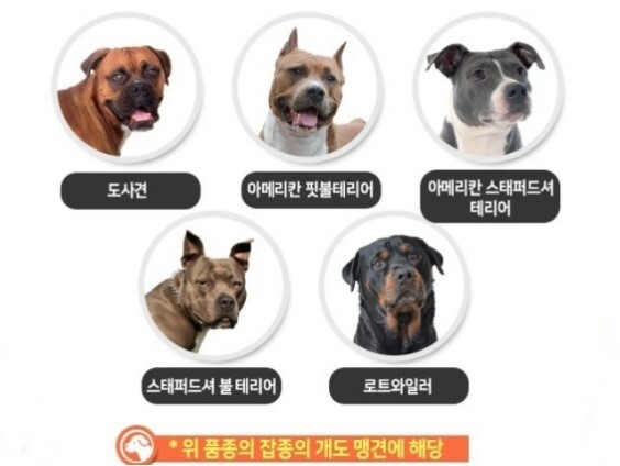 김제시 농업기술센터에 따르면 책임보험 의무가입 맹견 종은 도사견과 아메리칸 핏불테리어, 아메리칸 스태퍼드셔 테리어, 스태퍼드셔 불테리어, 로트와일러로 5종이며 5종의 자견(잡종의 개)도 맹견으로 포함된다고 밝혔다.