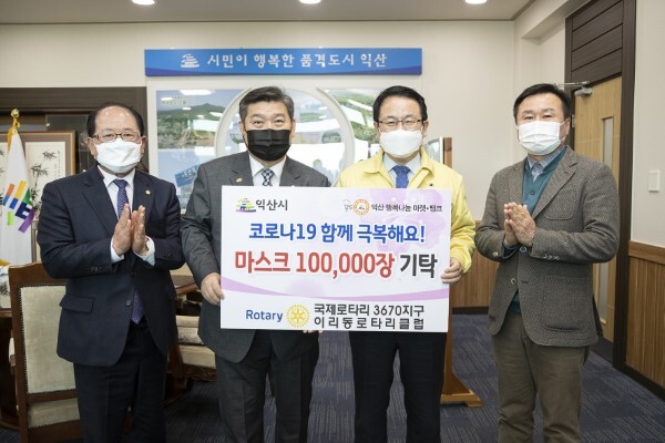 이리동로타리클럽(회장 이용섭)은 22일 익산시를 방문해 코로나19 극복을 위한 덴탈마스크 10만장을 기탁했다.