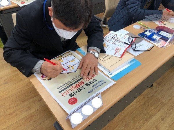 군산소방서는 특수시책의 일환으로 군산 관내 경로당을 방문해 노인을 대상으로 홍보용 색칠하기 도안을 활용한 주택용 소방시설 설치방법 및 사용법을 홍보하고 있다.