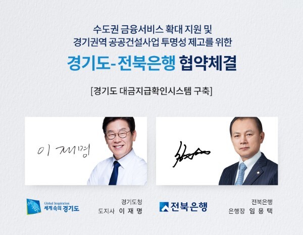 전북은행은 25일 수도권 금융서비스 확대 지원 및 경기권역 공공건설사업 투명성 제고를 위해 “경기도 대금지급확인시스템”을 오픈하고 경기도와 건전한 하도급 거래 문화 조성에 힘을 보태기로 했다.
