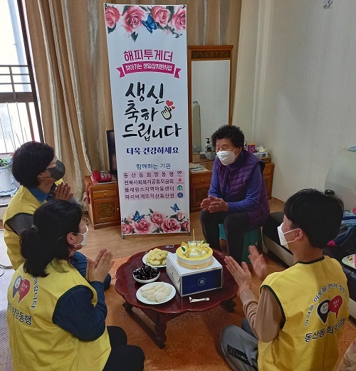 익산시 동산동 지역사회보장협의체는 지난 26일 생신을 맞은 독거 어르신에게 정성이 담긴 생신상을 차려 드리고 선물을 전달하는 ‘Happy Together 찾아가는 생일상 지원’ 사업을 실시했다.