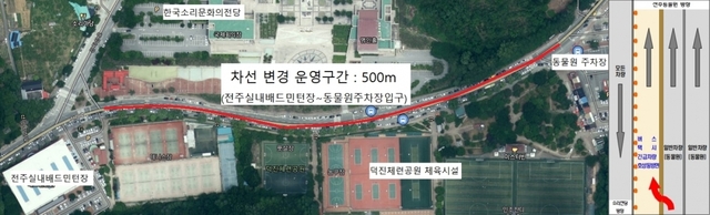 시에 따르면 다음 달 3일부터 5월 30일까지 전주동물원~한국소리문화의전당 500m 구간을 ‘양방향 편도 2차로’에서 ‘편도 3, 편도 1차로’로 바꿔 운영한다.