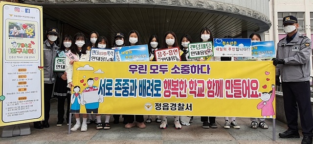 정읍경찰서(서장 김영록)는 30일 서영여자고등학교(교장 한병언) 정문 앞에서 등교시간에 맞춰 ‘학교폭력 예방 합동 캠페인’을 펼쳤다.