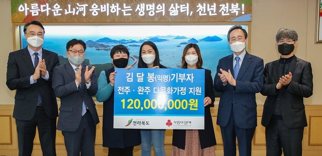 전북사회복지공동모금회는 31일 전북도청에서 김달봉씨(가명)가 기탁한 기부금(생계비) 1억2000만 원을 도내 다문화가정에 전하는 기부금 전달식을 열었다. 이날 전달식은 익명의 기부자로 알려진 김달봉 씨가 도내 어려운 다문화가정을 위해 써달라며 지정 기탁한 1억2000만 원을 다문화가정에 직접 전하기 위해 마련됐으며, 송하진 전북도지사, 박용훈 사회복지공동모금회 사무처장, 도내 다문화가정 관계자 등이 참석해 김달봉씨의 뜻을 기리고 행사를 축하했다.