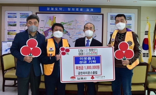 김제 금만라이온스클럽(회장 김병수)은 관내 저소득 가정을 위해 사용해 달라며 이웃돕기성금 180만원을 김제시에 기탁했다.