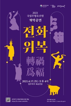 문화재청 국립무형유산원(원장 이종희)은 오는 17일 오후 4시부터 전주시 국립무형유산원 얼쑤마루 대공연장에서 개막공연 ‘전화위복(轉禍爲福)’을 진행한다.