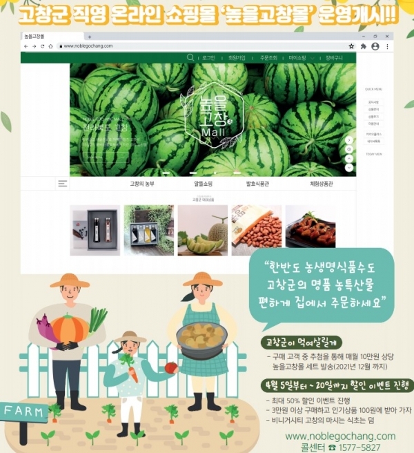 또 ‘고창군이 먹여살릴게’ 프로젝트로 오픈기간 고창 농수축산물 구매고객 중 5명에게는 추첨을 통해 고창농산물을 1년간 지급하는 통 큰 이벤트도 진행할 계획이다.