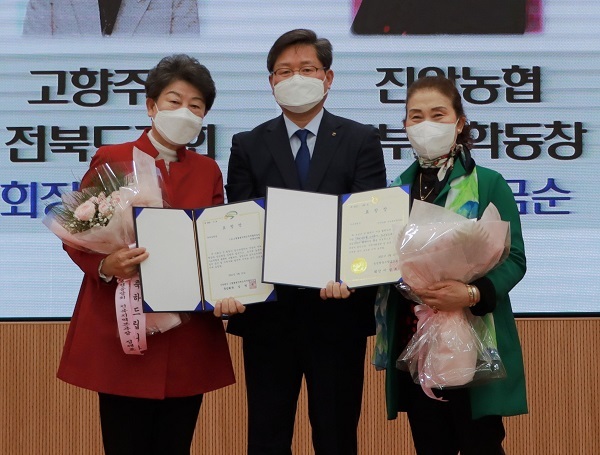 농가주부모임상은 여성농업인의 자기개발 및 복지증진에 크게 앞장서고 농촌의 활력화에 기여한 공이 큰 연합회에 수여하는 상으로, 익산 낭산농협 농가주부모임(회장 황규선), 진안 부귀농협 농가주부모임(회장 신순금), 고창 선운산농협 농가주부모임(회장 신미애)이 수상의 영예를 안았다.