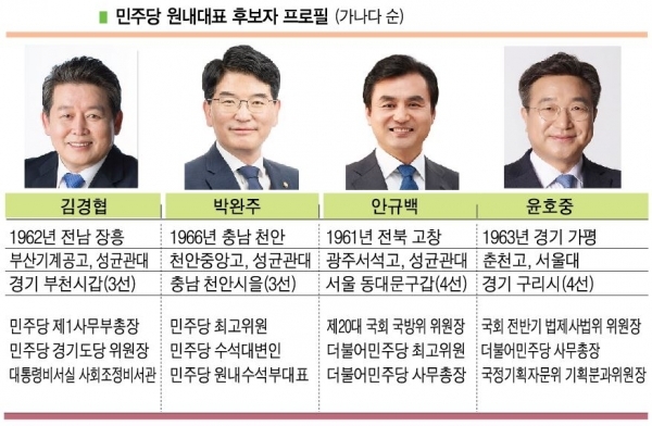 원내대표 후보군은 4명으로 압축됐는데 4선의 안규백·윤호중, 3선의 김경협·박완주 후보가 출사표를 던질 것으로 보인다.