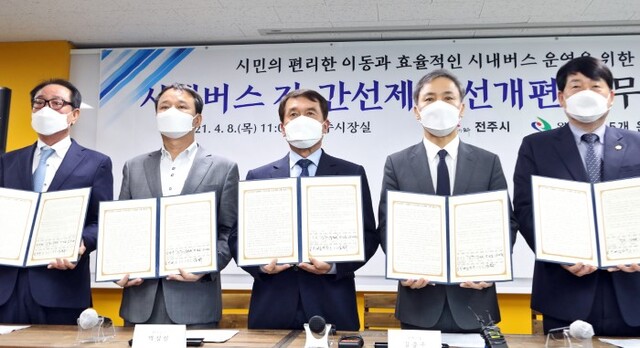 김승수 전주시장과 박성일 완주군수, 강동화 전주시의회 의장, 김재천 완주군의회 의장, 김진태 전주시내버스공동관리위원회 이사장은 8일 전주시장실에서 ‘전주·완주 시내버스 지간선제 노선개편 시행 업무협약’을 체결했다.