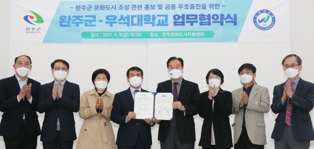 완주군과 우석대학교는 지난 9일 완주문화도시지원센터에서 박성일 군수, 남천현 총장을 비롯해 양 기관 관계자 10여명이 참석한 가운데 공동체문화도시 성공을 위한 업무협약을 체결했다.