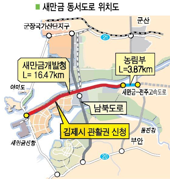 12일 전북도에 따르면 김제시는 최근 새만금 동서도로 16.472km를 김제시 관할로 요구하는 ‘공유수면매립지 귀속 지방자치단체 결정신청서’를 제출했다.