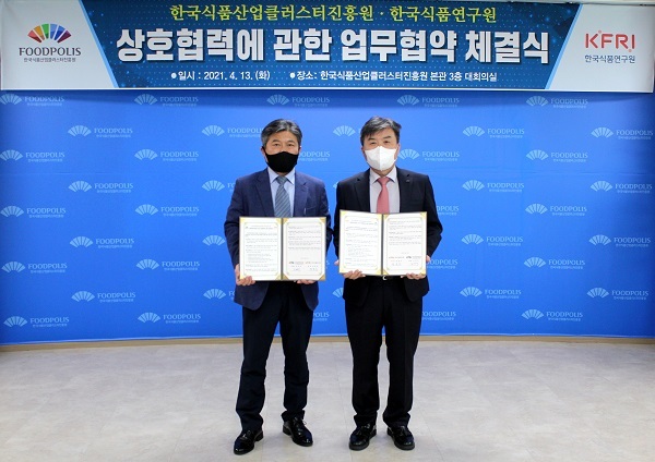 한국식품산업클러스터진흥원(이사장 김영재)과 한국식품연구원(원장 박동준)이 지난 13일 고령친화식품산업 육성·발전을 위한 업무협약을 체결했다.