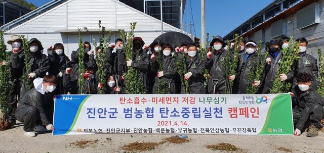 전북농협(본부장 정재호)과 진안군지부(지부장 정미경)는 14일 진안 관내 5개 농축협 임직원 30여명이 참석한 가운데 진안군 부귀면 축산농장에서 탄소흡수·미세먼지 저감을 위해 축사 주변 나무심기 행사를 가졌다.