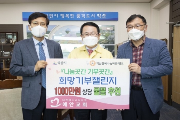 익산 예안교회(목사 오주환)는 15일 익산시를 방문해 코로나19로 위기에 처한 시민들을 돕는 익산 나눔곳간 채우기에 써 달라며 1000만원 상당의 후원물품을 쾌척했다.
