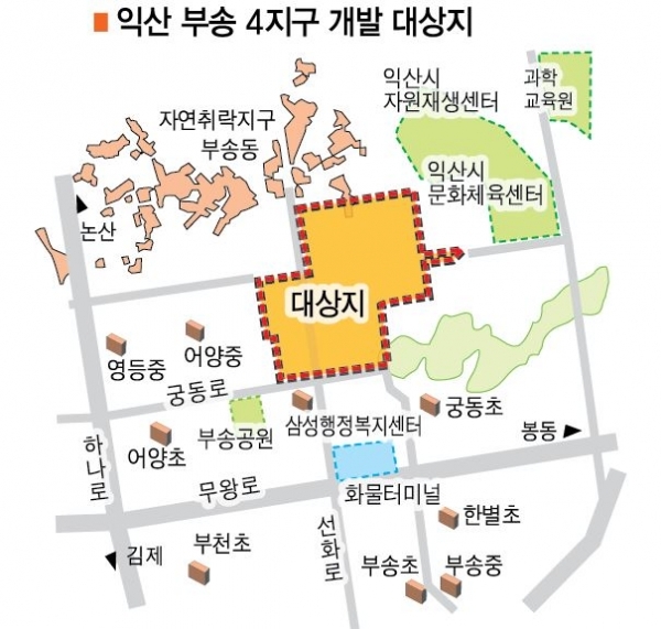 익산 부송4지구 내 초등학교 용지를 공동주택 용지로 변경하는 절차가 진행되면서, 공공성 약화 및 사업자 배불리기 우려를 낳고 있다.