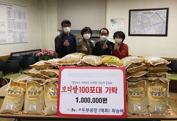 전주 삼천2동 두부공장(대표 최승해)은 19일 “복지 사각지대 주민, 독거노인, 저소득 만성질환자 등에게 전달해 달라”며 동 주민센터(동장 정진숙)에 100만 원 상당의 보리쌀(4㎏ 들이 100포)을 기탁했다.