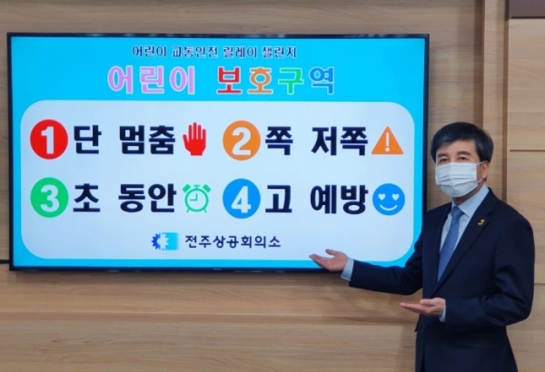 윤방섭 전주상공회의소 회장이 20일 어린이 보호구역 내 교통사고 예방에 대한 사회적 공감대 형성을 위해 어린이 교통안전 릴레이 챌린지에 동참했다.