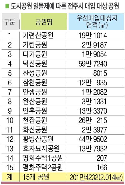 ‘도시공원 15곳 매입 추진’ 전주시, 각종 변수 걸림돌 되나