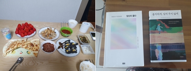 필자는 작년 겨울 ‘단지 공감’(이하 단감)이라는 이름의 심리 서적 낭독 커뮤니티를 시작했다. 이제 막 서로를 알아가기 시작한 우리들은 각자의 집에서 주 1회 저녁 시간에 만났다. 하루 일과를 모두 마친 후 다 함께 식사를 먹으며 1시간 정도 사소한 일상을 나누고, 번갈아가며 한두 페이지의 책을 낭독하고 감상을 공유한다. 심리 서적을 읽는 일은 표면 말하기에 머물러있는 것들 너머로 자신의 상태, 감정, 욕구를 살피는 일로 귀결된다. 그러다 보면 지금 여기에서 나라는 사람은 누구인지, 현재 내 삶의 이슈는 무엇인지, 그때 알아차리거나 표현하지 못했던 주요한 감정들, 갈등 상황을 촉발했던 숨은 욕구들은 무엇이었는지 새롭게 발견하는 장이 된다.