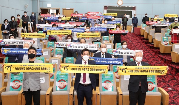 기념식 후에는 참여자 모두가 ‘국제태권도사관학교 설립을 염원합니다’라는 문구가 담긴 수건 퍼포먼스를 펼쳐 설립을 향한 주민결속을 다졌다.