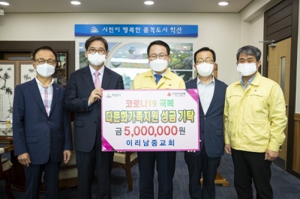 익산 이리남중교회(목사 박춘수)는 6일 정헌율 익산시장을 방문해 저소득 다문화가족을 위해 써 달라며 성금 500만원을 기부했다.