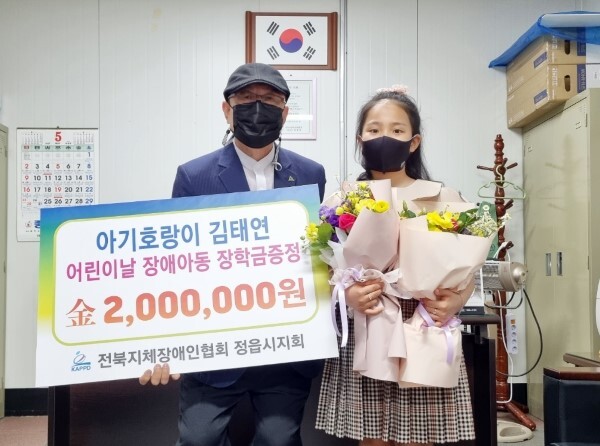 하재필 정읍시지회장은 “김태연 양이 후원해 준 장학금은 정읍시에 거주하는 장애아동들이 꿈과 희망을 펼치며 학업에 전념할 수 있도록 소중히 전달하겠다”고 말했다.