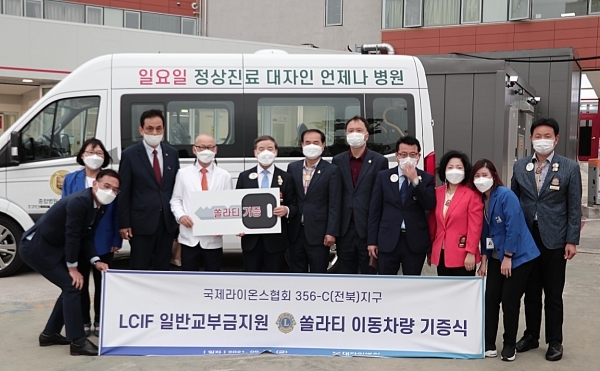 국제라이온스협회 356-C(전북)지구(총재 박병익)가 전주 대자인병원(병원장 이병관)에 쏠라티 특장차량을 기증했다.